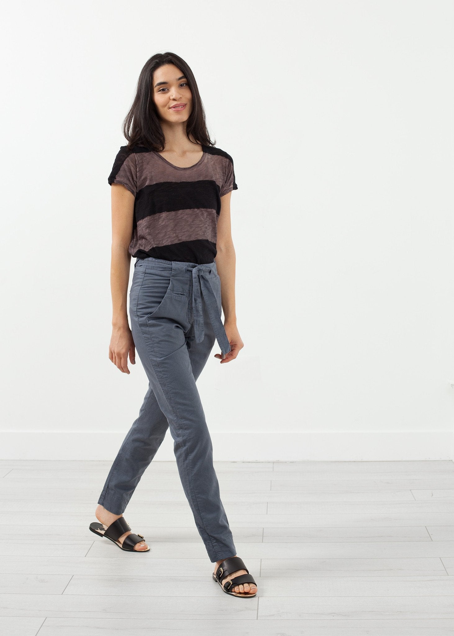 The straight silhouette and loose waistline offers a boyfriend fit in the Troupy Pant. Waist tie. Front zip fly. Front angled pockets with coin pocket and back pockets. Hannes Roether. Color Space. 75% Silk, 25% Cotton. Made in the EU. Ashley is wearing an X Small.